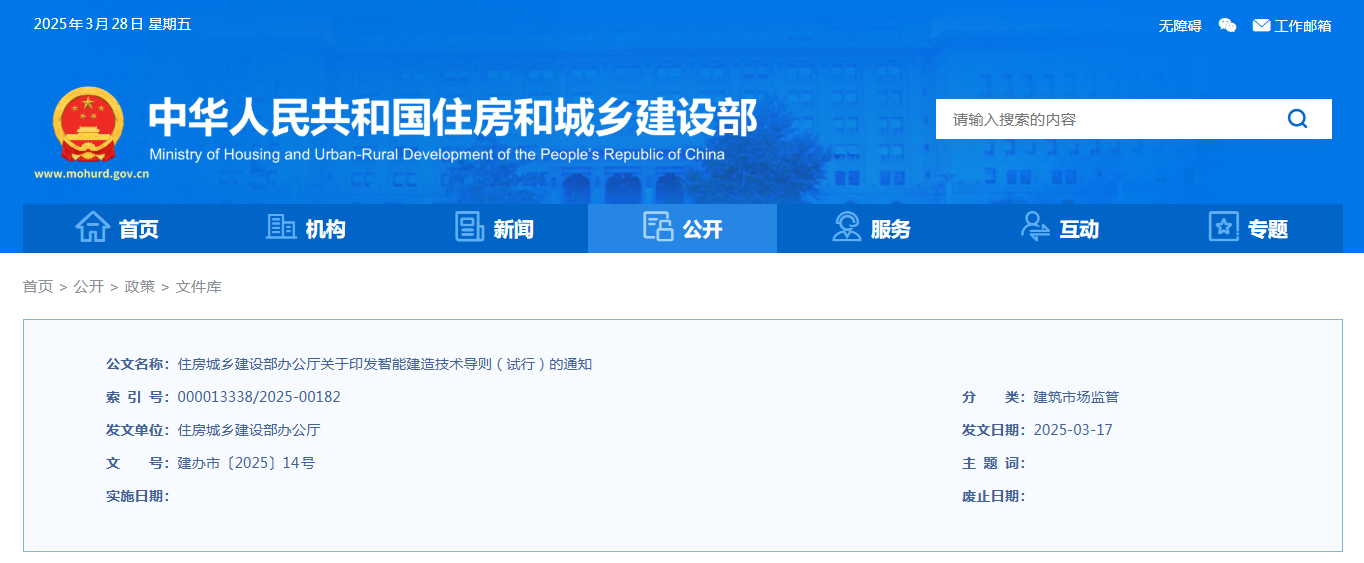 為貫徹落實《中共中央辦公廳、國務院辦公廳關于推進新型城市基礎設施建設打造韌性城市的意見》等文件要求,加快推進智能建造技術在工程建設全生命期應用,推動建筑業(yè)高質(zhì)量發(fā)展,住房城鄉(xiāng)建設部組織編制了《智能建造技術導則(試行)》。現(xiàn)印發(fā)給你們,請結合實際參照執(zhí)行。